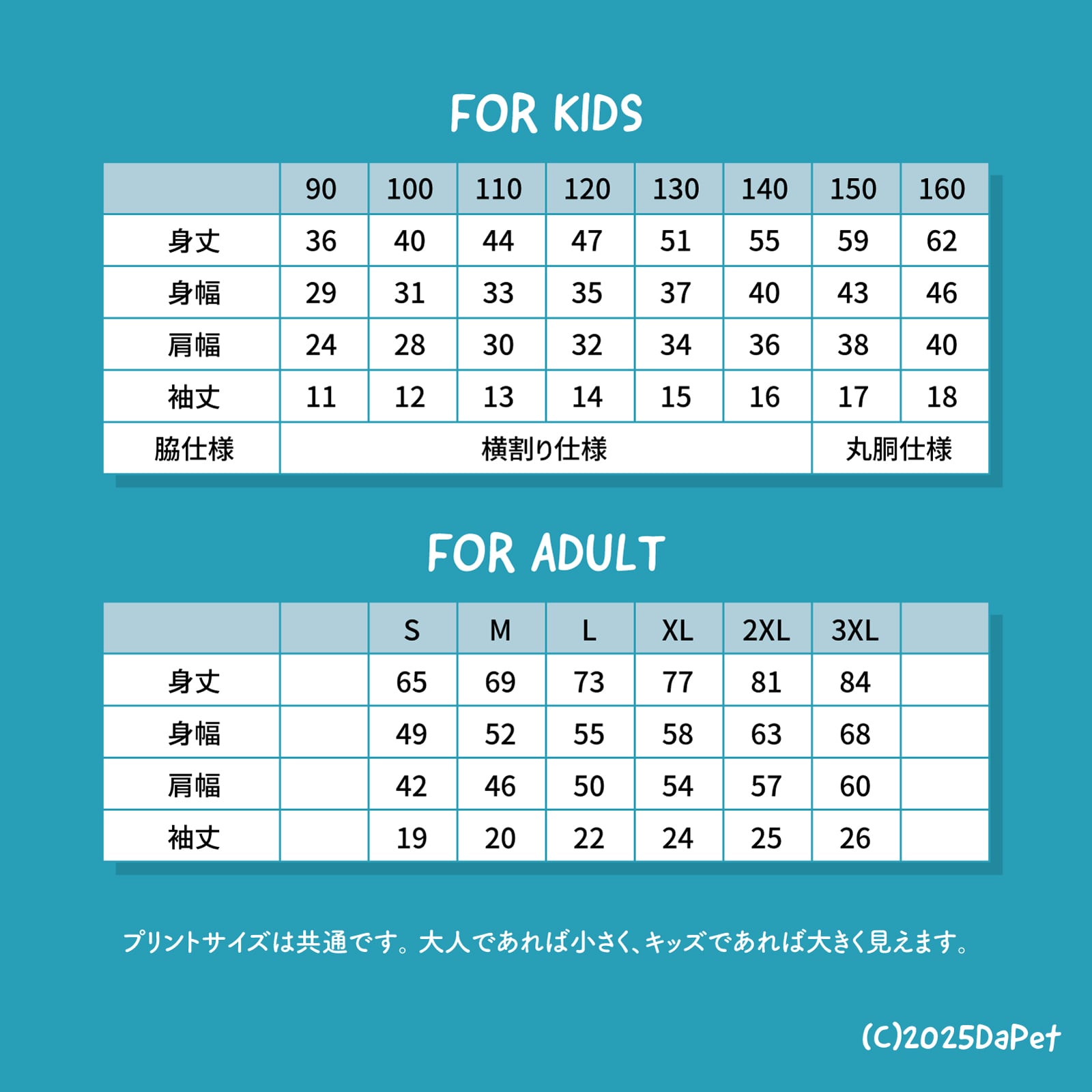 プリントサイズは共通です。 大人であれば小さく、キッズであれば大きく見えます。